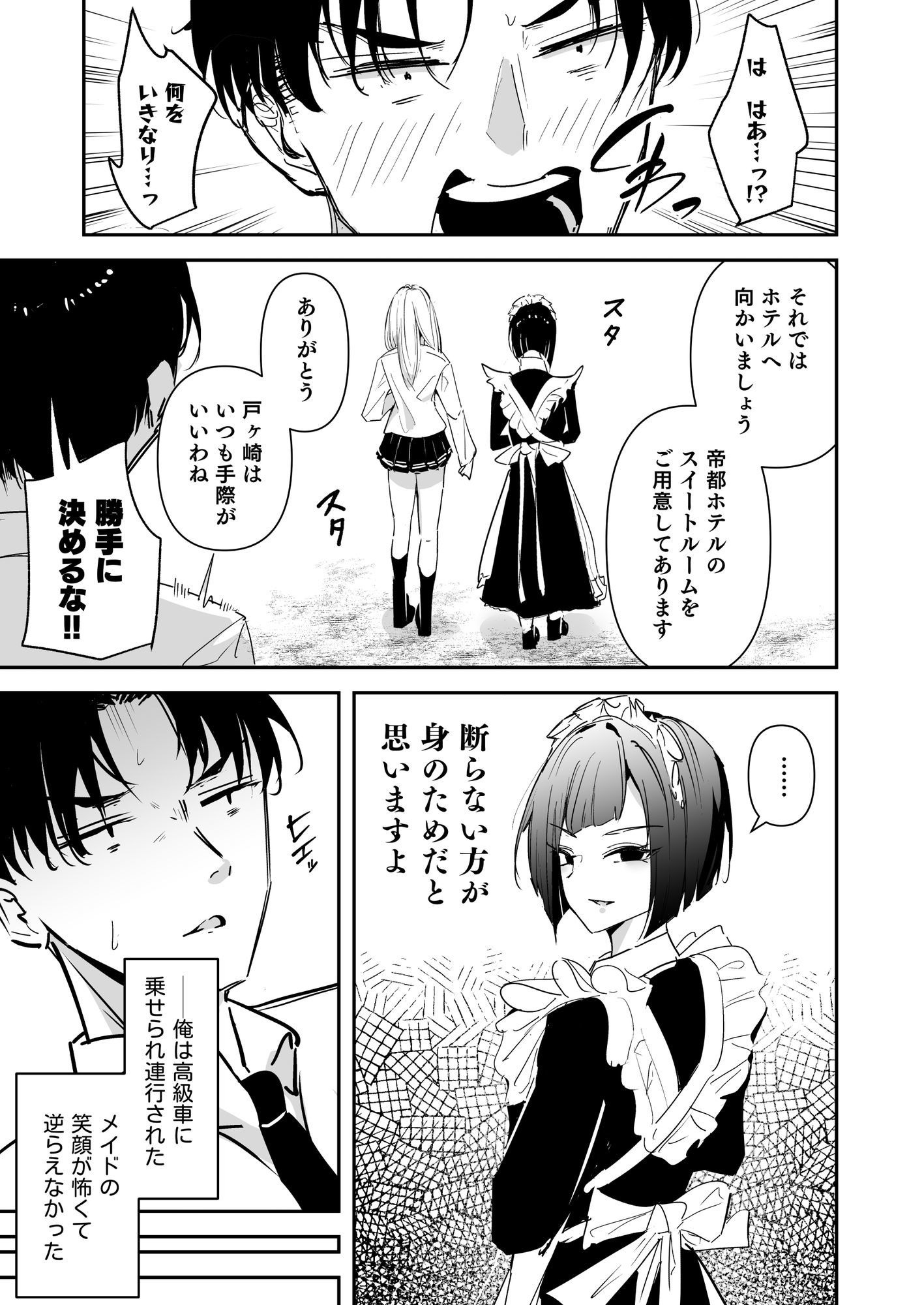 大地は「勝手に決めるな!!」と言ったものの、メイドの(断らない方が身のためだと思いますよ)という無言のプレッシャーに負け、結局一緒にホテルに行くことに。